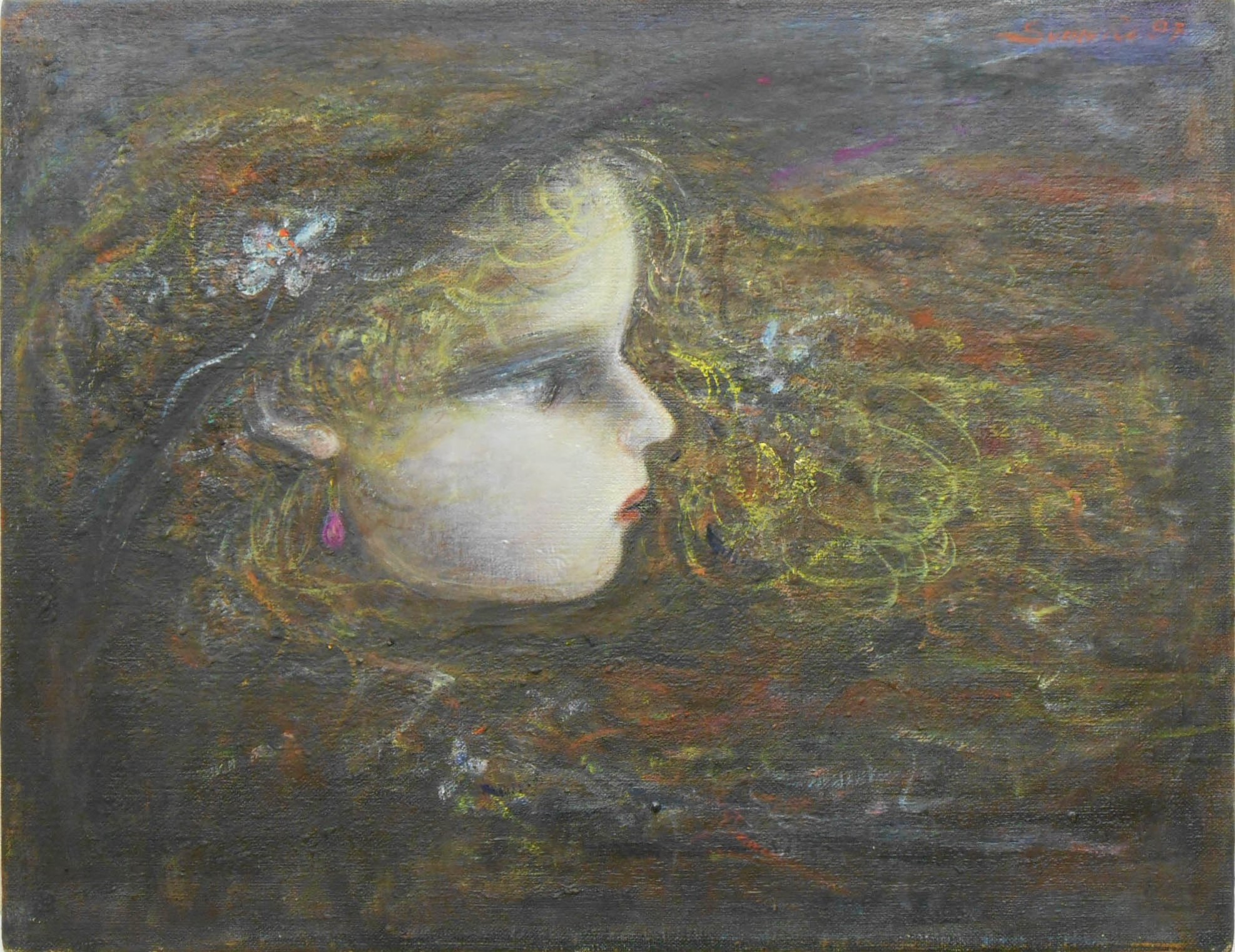白っぽい画面に、黒ずんだ裸婦が浮かぶ。その周辺に三角、死角四角、矢印といった記号が、落書きのように描かれている。かつて色面追及にユニークな個性を出していたが、最近、形が現れてきた。具象らしきものは裸婦だけで、あとは抽象だ。それもきちんと整わず、野性的な描写が多い。